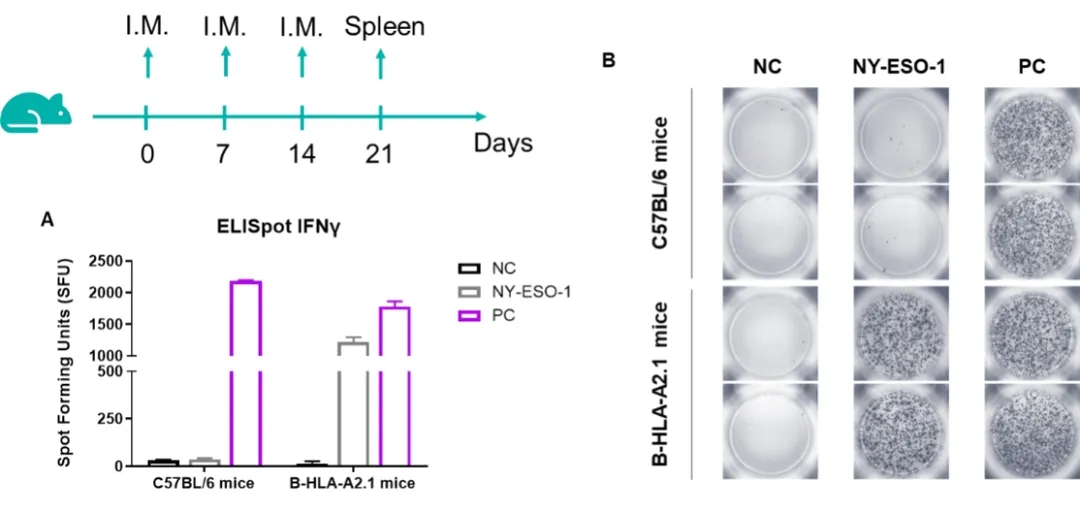 IFN-γ ELISpot检测B-HLA-A2.1小鼠免疫应答。9 ~ 10周龄雄性B-HLA-A2.1小鼠分别在双下肢内侧肌肉免疫PBS和NY-ESO-1多肽(n = 3),末次免疫7天后进行ELISpot检测。