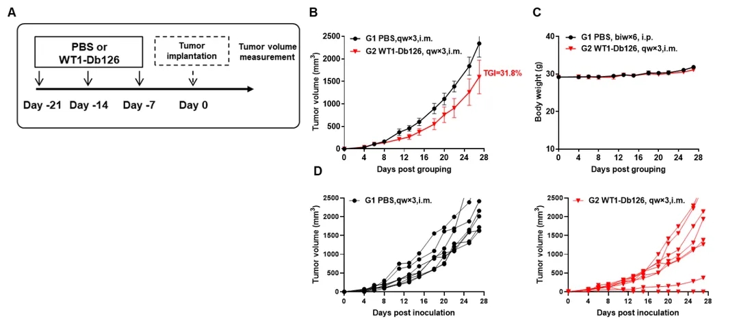 (A) 实验方案。(B) WT1-Db126预防性治疗的抗肿瘤活性。B-HLA-A2.1小鼠(每组8只)根据A中所示方案,分别用WT1-Db126疫苗(150μg)或PBS免疫接种。最后一次免疫后一周,将B-HLA-A2.1/WT1 MC38细胞接种于小鼠右侧背部。(C) 治疗期间小鼠体重变化。D) 不同组别个体肿瘤生长曲线。WT1-Db126多肽疫苗能够控制B-HLA-A2.1小鼠的肿瘤生长,证明B-HLA-A2.1小鼠是评价疫苗体内活性的良好临床前模型。
