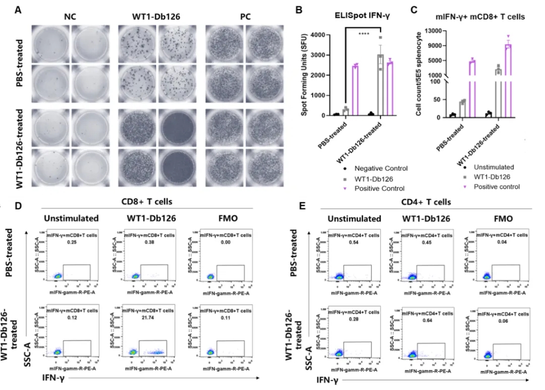 (A) 免疫后小鼠脾细胞ELISpot结果的代表性图像,(B) ELISpot实验定量分析结果,(C-E) B-HLA-A2.1小鼠中WT1-Db126特异性的CD4+和CD8+T细胞。这些结果证明B-HLA-A2.1小鼠可以作为肿瘤药效的临床前模型,用于评价肿瘤疫苗活性。
