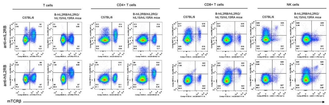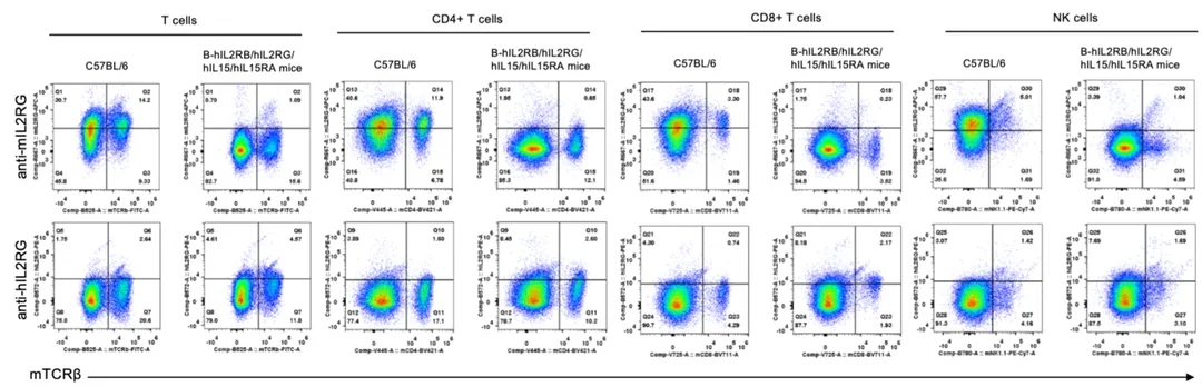 流式细胞术分析种属特异性IL2RB和IL2RG在纯合B-hIL2RB/hIL2RG/hIL15/hIL15RA小鼠中的表达。