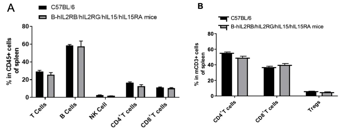 IL2RB、IL2RG、IL15和IL15RA基因的人源化不会改变脾脏中各类型免疫细胞的整体发育、分化或分布。