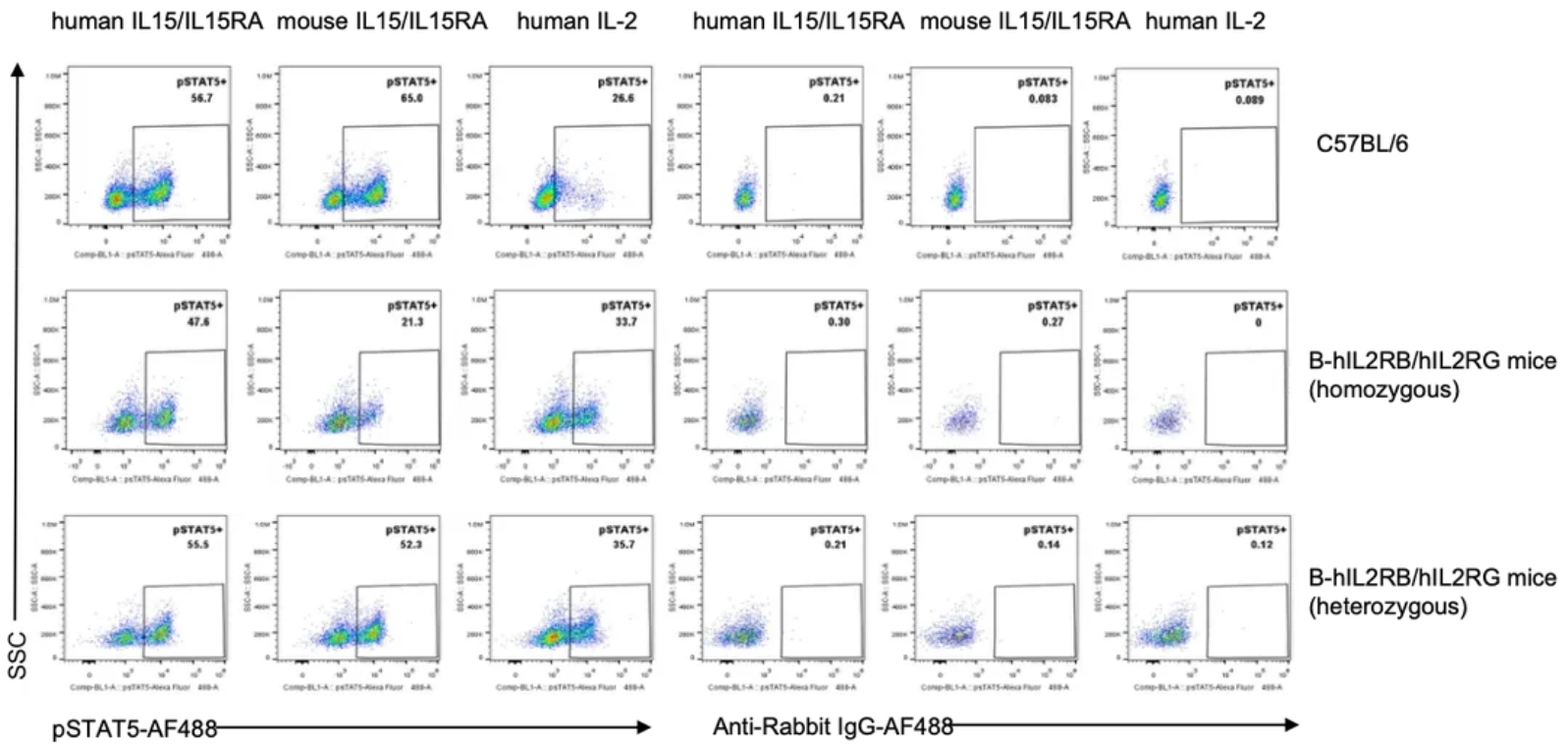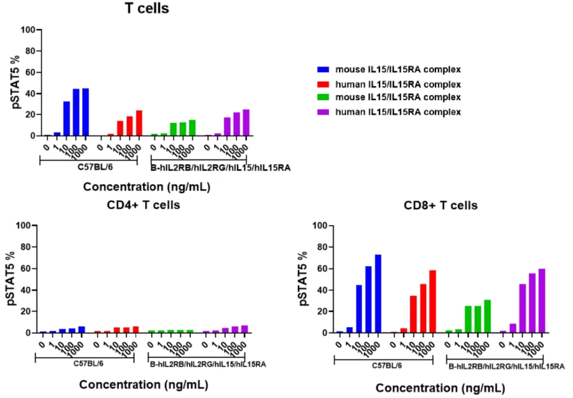 *同时,我们使用细胞因子IL2进行了同样的功能分析,实验结果表明人IL2在人源化小鼠的T细胞中能有效诱导pSTAT5的产生并呈剂量依赖性。在相同浓度下,人IL2在人源化小鼠体内诱导的pSTAT5高于野生型C57BL/6小鼠,说明B-hIL2RB/hIL2RG/hIL15/hIL15RA小鼠对人IL2更敏感(数据未展示,此模型亦可用于细胞因子IL2相关药物的研究)。