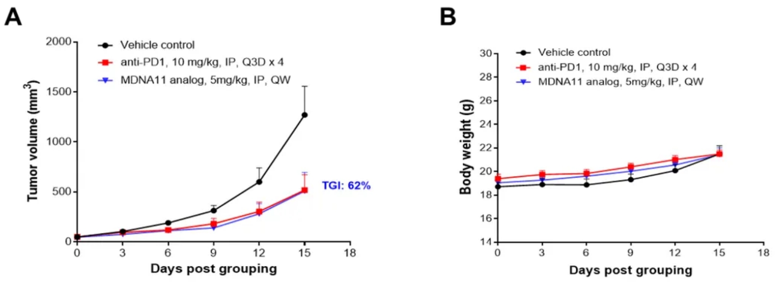 在B-hIL2RB/hIL2RG/hIL15/hIL15RA小鼠中接种野生MC38细胞系,通过腹腔注射长效IL2超级因子(MDNA11类似物),结果显示:MDNA11类似物对肿瘤生长具有有效的控制作用。