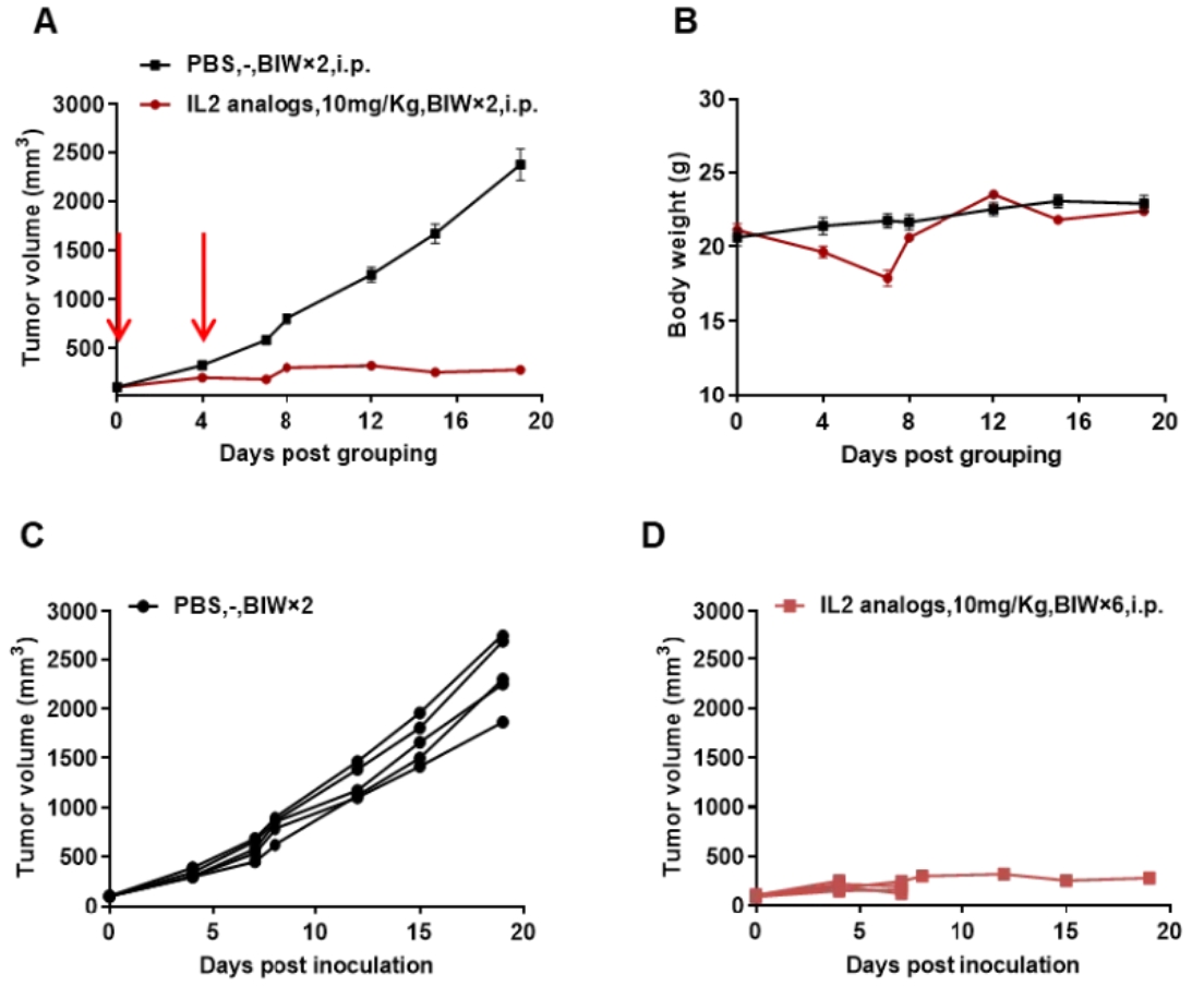 在B-hIL2RB/hIL2RG小鼠中接种野生MC38细胞系,通过腹腔注射IL2类似物(客户提供),结果显示:IL2类似物对肿瘤生长具有有效的控制作用。
