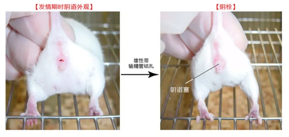 用切除输精管的雄性ICR小鼠和雌性ICR小鼠交配,可诱导产生用于输卵管移植的假孕鼠。与不孕鼠交配后,尽管其自身产生的卵母细胞已经退化,但其子宫处于胚胎移植的接受状态。常用的交配方法有结扎雄鼠和发情雌鼠1:2合笼,过夜合笼后第二天在雌鼠阴道口检栓块。