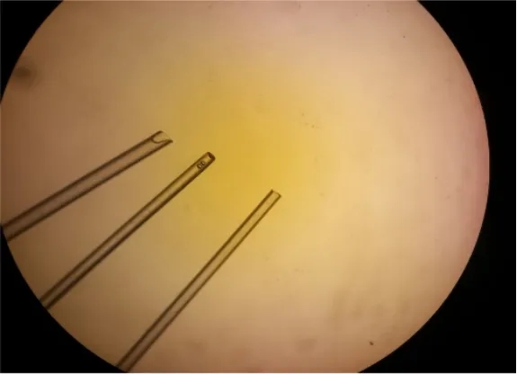 输卵管移植使用的毛细玻璃管,每根移植管的内径都应大于1个二细胞期胚胎的直径而小于2个二细胞期胚胎的直径。