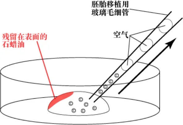 胚胎从KSOM中转移到M2中,更换移植针,从没有石蜡油的一侧液面吸取胚胎。一侧输卵管移植8~15枚胚胎。