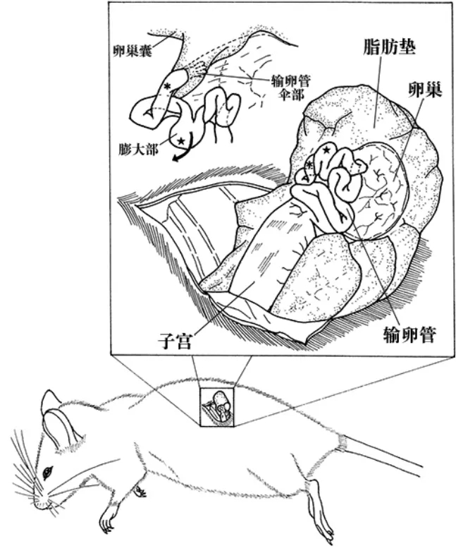 将准备好的假孕鼠横向放置于显微镜底座上,调整显微镜倍数、假孕鼠位置以及外光源亮度和照射范围,使视野下清晰的看到输卵管的膨大部位置。