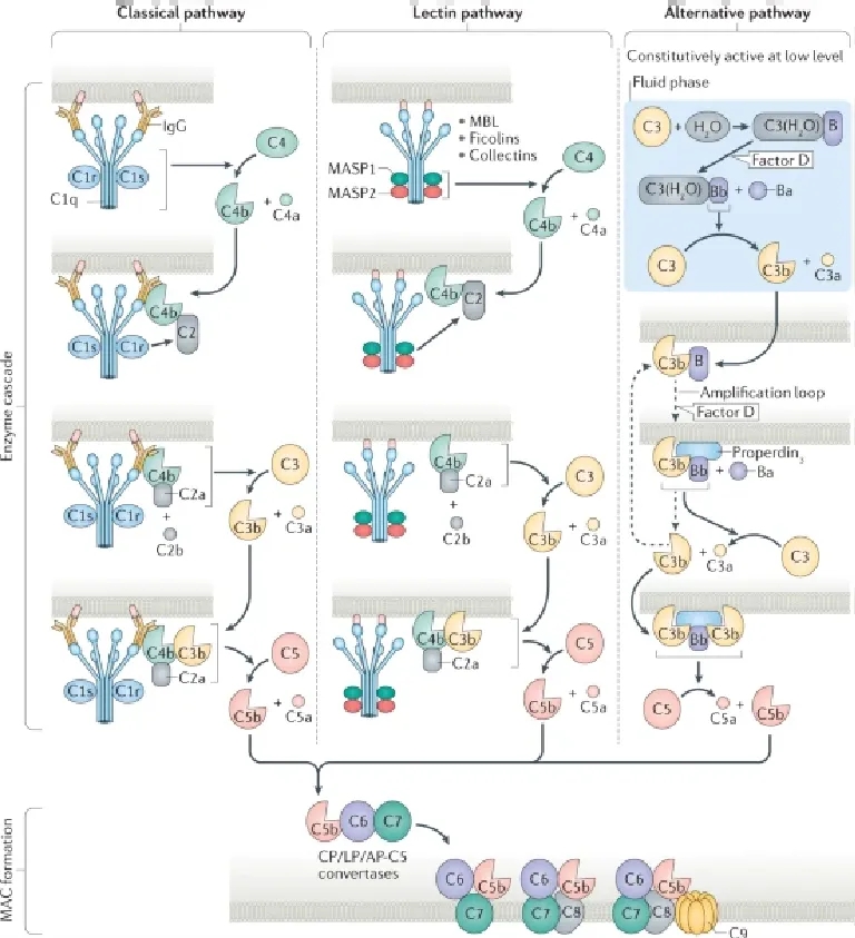 替代途径与经典和凝集素途径的不同之处在于,它会自发且持续地以低速活动,并且其激活可以被放大。该途径涉及因子D,它在正常血液中主要以其活性形式存在,以及唯一已知的补体系统的积极调节器--固定素。替代途径C3转化酶的初始组装效率取决于病原体细胞壁内末端糖的密度或结合C3b微环境内自身末端唾液酸的密度。将额外的C3b与现有的替代途径C3转化酶结合,产生C5转化酶,导致C5a和C5b的产生。[2]