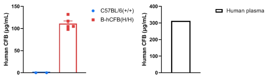通过ELISA对野生型C57BL/6小鼠和纯合B-hCFB小鼠中的种属特异性CFB表达进行分析。从野生型C57BL/6小鼠和纯合B-hCFB小鼠中分离出血清,并使用种属特异性的CFB ELISA试剂盒(Abcam,ab137973)进行ELISA分析。人的CFB仅在纯合B-hCFB小鼠中可检测到,而在野生型小鼠中则无法检测到。