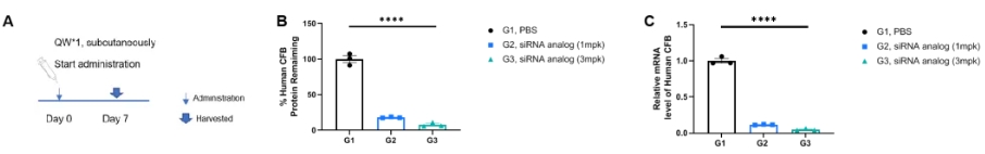 核酸药物对B-hCFB小鼠中人CFB的抑制效率。将B-hCFB小鼠随机分为三组(每组3只,8周龄,雄性)。根据专利合成的针对人CFB的siRNA类似物(G2 1mpk, G3 3mpk)和G1 PBS分别给予小鼠。在第7天处死小鼠,收集肝组织和血浆以通过qPCR和ELISA检测人CFB mRNA和蛋白质的表达水平。(A)实验处理的示意图。(B)B-hCFB小鼠剩余%的人类CFB蛋白质。(C)肝脏中人类CFB mRNA的表达。治疗组(G2、G3)中的人CFB明显减少与对照组(G1)相比。值表示为平均值±SEM。通过单因素ANOVA测试确定显着性差异。****p<0.0001。