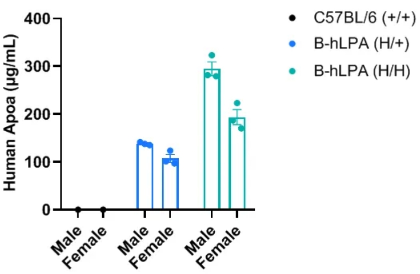 通过ELISA在B-hLPA小鼠中进行特异性Apo(a)蛋白表达分析。收集野生型C57BL/6小鼠、杂合B-hLPA小鼠、纯合B-hLPA小鼠血清,所有小鼠均为7周龄。每种性别的3只B-hLPA小鼠用于检测,每种性别的1只野生型C57BL/6小鼠作为对照。人类Apo(a)仅在杂合和纯合B-hLPA小鼠中可检测到,而在野生型C57BL/6小鼠中则无法检测到。