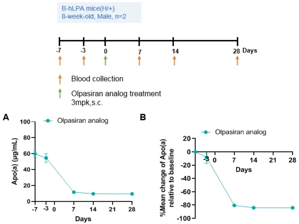 对异质B-hLPA小鼠在响应olpasiran类似物时血浆Apo(a)水平的变化。Olpasiran类似物(由客户提供)是一种针对脂蛋白(a)能有效降低血浆Lp(a)浓度的双链小干扰RNA(siRNA)。如图所示,Olpasiran类似物降低了杂合B-hlpa小鼠(a)的载脂蛋白(a)浓度,单次给药后比基线(B)降低了80%以上。这些小鼠可用于临床前疗效研究。