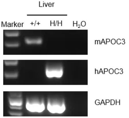 通过RT-PCR对野生型C57BL/6小鼠和B-hAPOC3小鼠中APOC3 mRNA表达进行种属特异性分析。从野生型C57BL/6小鼠和纯合B-hAPOC3小鼠中提取肝RNA,通过反转录合成cDNA文库,使用小鼠或人APOC3引物进行PCR。小鼠Apoc3 mRNA只在野生型C57BL/6小鼠中检测到。人APOC3 mRNA仅在纯合B-hAPOC3小鼠中检测到,而在野生型小鼠中检测不到。