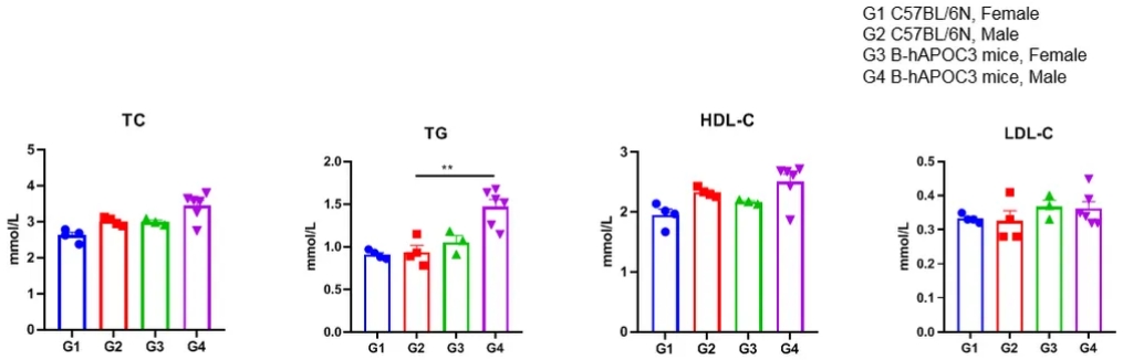 分析B-hAPOC3小鼠和野生型C57BL/6小鼠(5周大)的血浆TG,TC,LDL-C和HDL-C浓度。B-hAPOC3小鼠的TG明显高于野生型C57BL/6小鼠。TG,甘油三酯;TC, 总胆固醇;HDL-C,高密度脂蛋白胆固醇;LDL-C,低密度脂蛋白胆固醇。