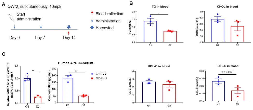 核酸药物对B-hAPOC3小鼠中人APOC3的抑制效率。(A)实验处理示意图。(B)治疗后B-hAPOC3小鼠的血脂水平。与对照组(G1)相比,治疗组(G2)TG明显降低。(C)肝脏中人APOC3 mRNA和血清中人APOC3蛋白表达情况。与对照组(G1)相比,治疗组(G2)中人APOC3 mRNA明显减少,抑制率为73.4%,证明B-hAPOC3小鼠为人APOC3靶向核酸药物的体内评价提供了一个强大的临床前模型。值表示为均值±SEM。
