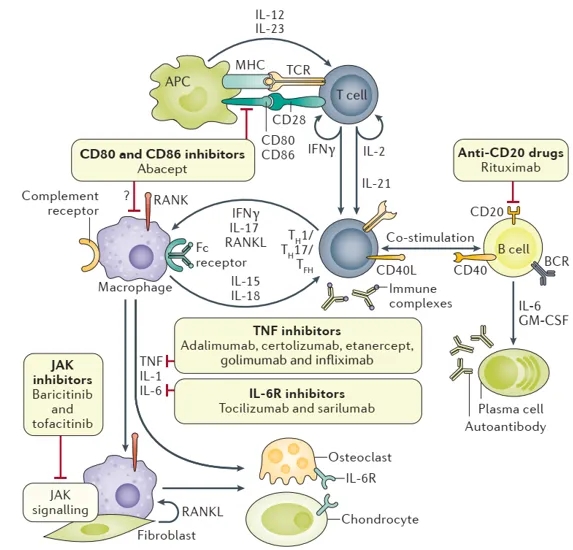 针对这些信号通路开发的药物,阻断参与启动的促炎细胞因子的作用,最终可以缓解类风湿性关节炎。由于现阶段RA治疗手段和结果的局限性,临床仍需要更多更优效的治疗方法以帮助患者获得更好的治疗收益。