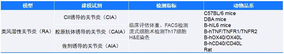 临床前用以RA药效评价的动物模型大致可分为诱导型和转基因型两大类。常见的诱导模型有胶原诱导关节炎(CIA)、胶原抗体诱导关节炎(CAIA)、佐剂诱导关节炎(AIA)及其他的药物诱导的关节炎模型,CIA是RA研究最广泛的诱导型动物模型;CAIA属于CIA模型的扩展,通过靶向Ⅱ型胶原抗体诱导关节炎的发生。转基因小鼠模型有人TNF-α转基因模型和K/BxN转基因模型等。
