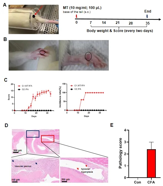 佐剂诱导的大鼠关节炎。大鼠(7周,雄性)于第0天在尾部底部皮下注射MT/IFA混悬液(10 mg/ml;100μL),从第7天到结束,每两天记录一次体重和评分(A);佐剂在大鼠的爪子中产生肿胀和发红(B),AIA大鼠的所有爪子都被评分(C);HE染色显示AIA大鼠可见炎症、血管翳、滑膜增生(D,E)。