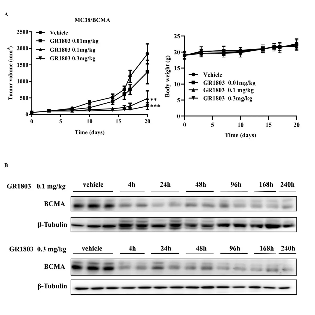 A.GR1803抑制皮下接种B-hCD3EDG小鼠的B-hBCMA MC38(310720)肿瘤的生长。注射对照或所示剂量的GR1803,并在所示日期测量肿瘤体积和体重。数据表示为肿瘤体积的平均值±SEM或体重的平均值±SD。**P<0.01 vs.对照,***P<0.001 vs. 对照;n=8。B.GR1803引起肿瘤组织中BCMA的下调。B-hCD3EDG小鼠皮下接种B-hBCMA MC38(310720)。对荷瘤小鼠进行单次静脉注射对照或GR1803,并在所示时间切除肿瘤组织。采用Western印迹法检测肿瘤组织中BCMA的表达水平。