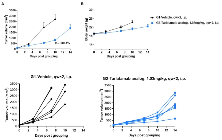 图5.(上图)抗人CD3/DLL3双特异性抗体(Tarlatamab类似物,内部合成)在B-hCD3EDG小鼠中的抗肿瘤活性;(下图)小鼠个体肿瘤生长曲线