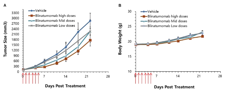 当肿瘤体积约为150±50 mm^3时,小鼠被分为对照组和治疗组(n=6)。高剂量CD3E双特异性抗体(Blinatumomab,商业化产品)显著抑制了肿瘤的生长,证实了B-hCD3E小鼠模型是评估针对人CD3E双抗体内药效的有力工具。(A) 肿瘤平均体积 ± SEM,(B) 小鼠平均体重 ± SEM。