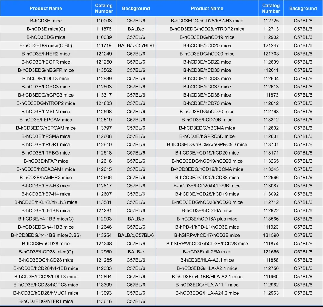 随着研究的深入,相信CD3双抗将在肿瘤和自免治疗领域发挥更大的作用。百奥动物拥有多种CD3E/CD3EDG相关靶点人源化的小鼠模型,为更多CD3双抗在肿瘤及自免领域的药效及安全性研究提供助力。