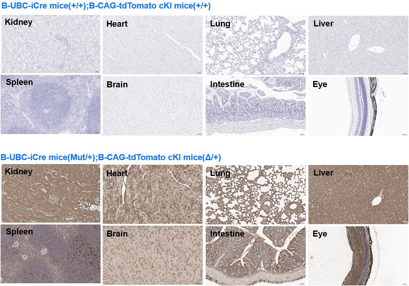 B-UBC-iCre mice(Mut/+); B-CAG-tdTomato cKI mice(Δ/+): Significant brown positive signals were observed in all examined tissues (heart, liver, spleen, lung, kidney, brain, intestine, and eye), indicating ubiquitous expression of the tdTomato protein. Note: (Mut/+) indicates the presence of Cre recombinase; (Δ/+) indicates the successful excision of the Stop sequence.
