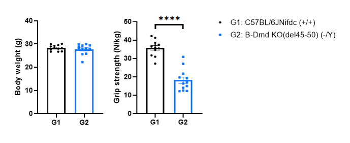 Behavioral performance in wild-type C57BL/6JNifdc and homozygous B-Dmd KO(del45-50) mice. Grip strength tests were conducted to assay the behavioral performance in wild-type C57BL/6JNifdc and homozygous B-Dmd KO(del45-50) mice (male, 3-month-old, n=12). Grip strength results showed the strength produced by forelimb was ~18 N/kg in homozygous B-Dmd KO(del45-50) mice, which was significant weaker than that in wild-type control mice. All grip strength measurements are normalized to the individual animal’s body weight. Values are expressed as mean ± SEM. Significance was determined by unpaired t test. *P < 0.05, **P < 0.01, ***P < 0.001, ****P < 0.0001.