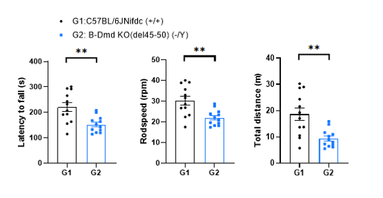 Behavioral performance in wild-type C57BL/6JNifdc and homozygous B-Dmd KO(del45-50) mice. Rotarod tests were conducted to assay the behavioral performance in wild-type C57BL/6JNifdc and homozygous B-Dmd KO(del45-50) mice (male, 3-month-old, n=12). Rotarod tests were performed to assay the motor coordination. The latency to fall, rodspeed and total distance were significantly decreased in homozygous B-Dmd KO(del45-50) mice, showing the impairment of motor coordination and balance. Values are expressed as mean ± SEM. Significance was determined by unpaired t test. *P < 0.05, **P < 0.01, ***P < 0.001, ****P < 0.0001. .